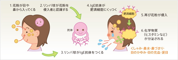 - 花粉が体に入ってくると、以前作られた抗体が働き、涙・鼻水を促進する